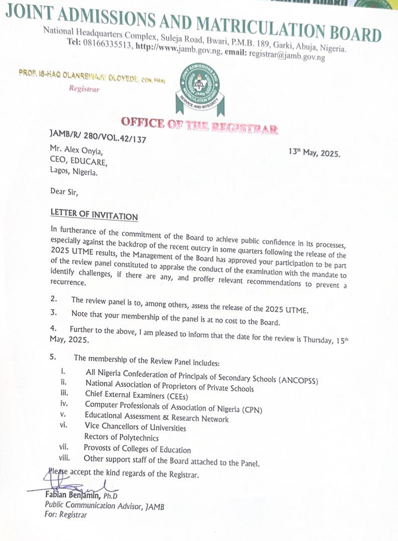 In a letter dated May 13 and signed by Fabian Benjamin, JAMB’s Public Communication Advisor, the board formally invited education consultant Alex Onyi to join the review panel.