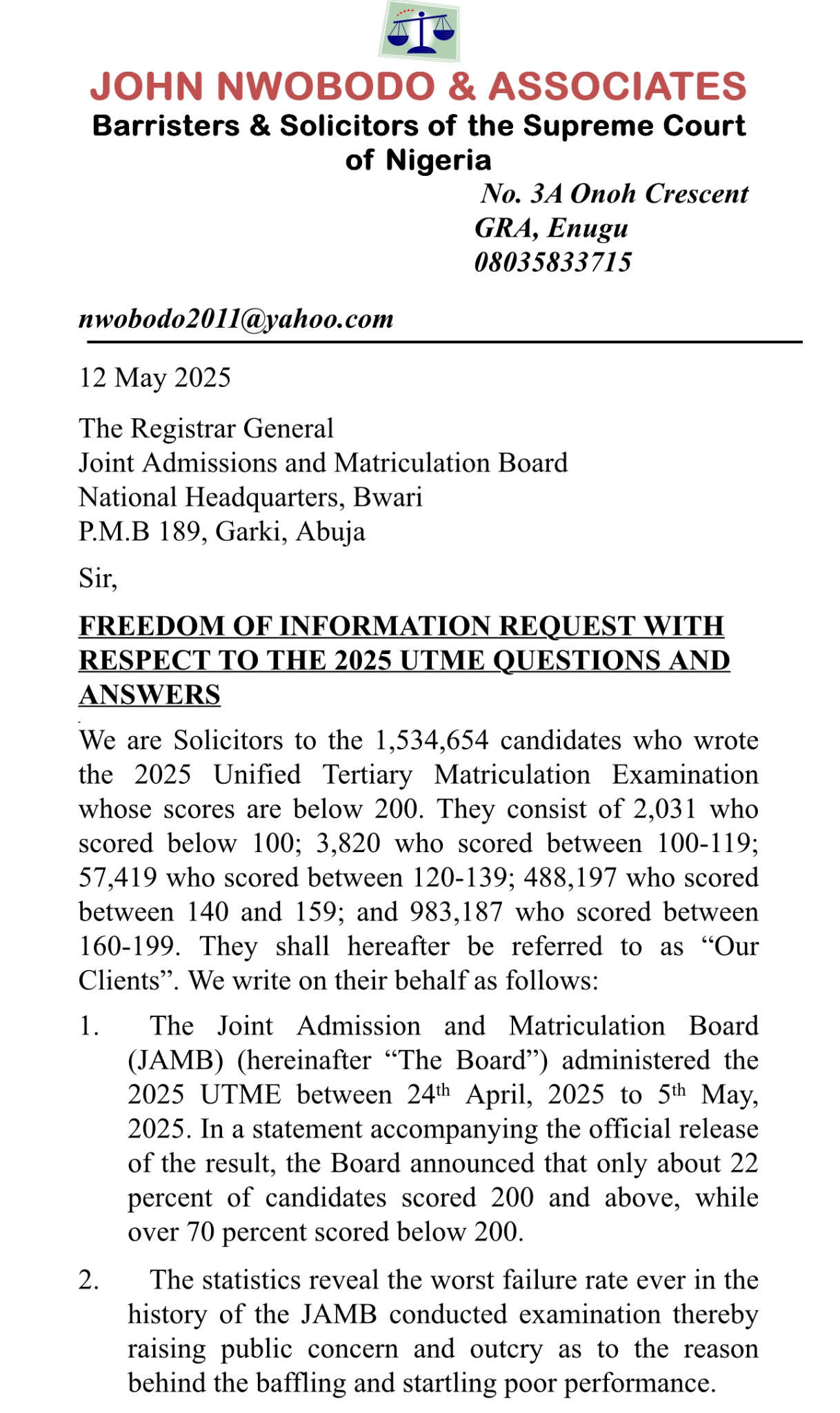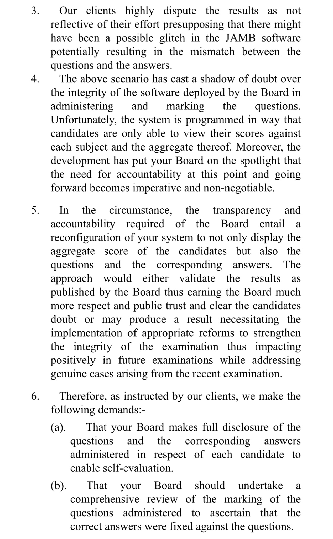 “Our clients highly dispute the results as not reflective of their effort, presupposing that there might have been a possible glitch in the JAMB software, potentially resulting in the mismatch between the questions and the answers.”