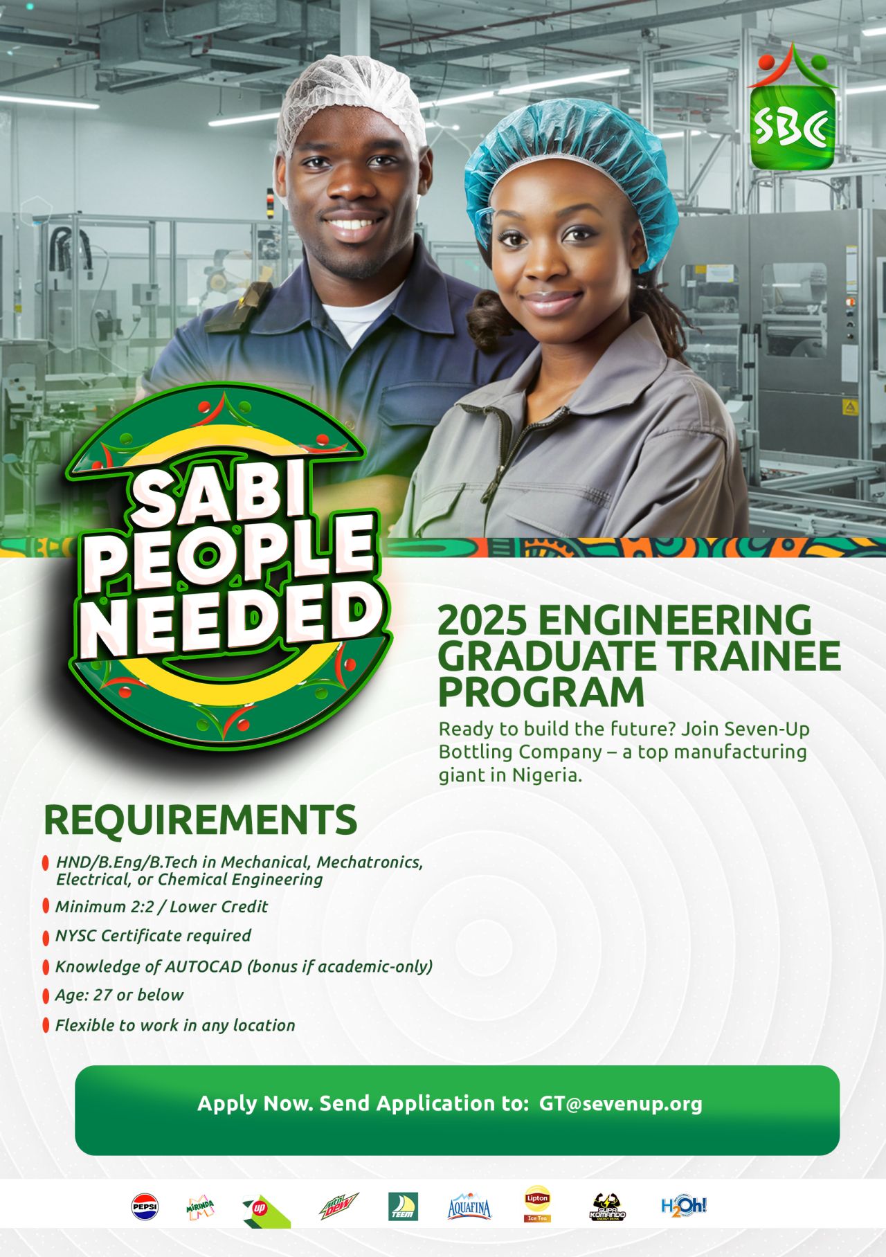 Are you a passionate engineering graduate eager to kickstart your career in the manufacturing industry? Seven-Up Bottling Company (SBC), one of Nigeria’s top FMCG giants, is calling on young, talented minds to join its 2025 Engineering Graduate Trainee Program.